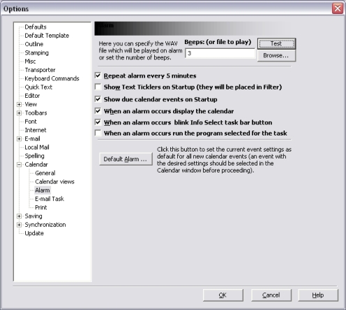 To set the Alarm options choose Menu Ribbon | Home | Options | Calendar | Alarm.