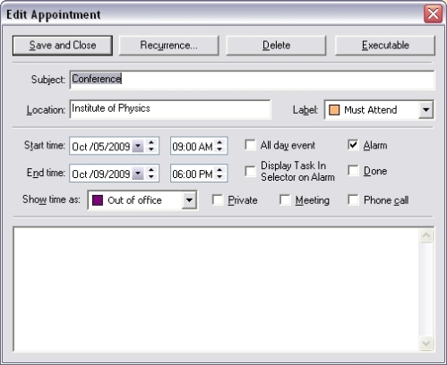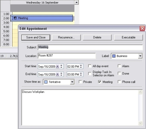 Alternatively, you can right-click on the event in the DayWeek or Month view and choose Open to invoke the Edit Appointment dialog.