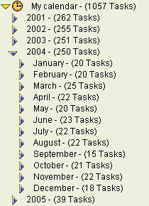Info Select allows to view the Calendar events in the Selector as an Outline. Simply expand the Calendar item to view the Calendar entries grouped by Year, Month and Day. This allows you to work with your Calendar in the same way as you work with Topics. For example, you can locate tasks scheduled on December, 15, 2003 by expanding the Calendar and going into the corresponding Topic, or move an event to another month or day by dragging it to the appropriate Topic.