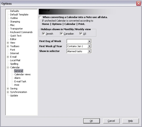 You can set various options for the Calendar. Choose Menu Ribbon | Home | Options | Calendar | General.