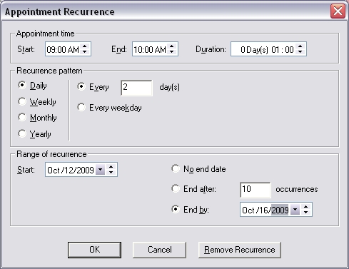 3. Click the Recurrence button. The Appointment Recurrence dialog box appears.