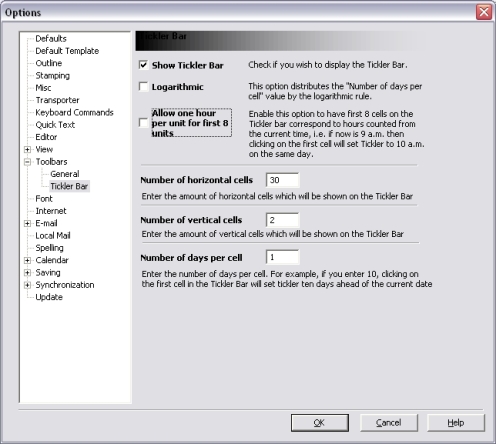 3. Set the desired Tickler Bar properties:Logarithmic distributes the Number of days per cell value by a logarithmic rule;Allow one hour per unit for first 8 units sets the first 8 cells on the Tickler Bar to correspond to hours counted from the current time. For example, if it is currently 9 am, clicking on the first cell will set a Tickler for 10 am on the same day.Number of horizontal cells sets the number of horizontal divisions of the Tickler Bar;Number of vertical cells sets the number of vertical divisions of the Tickler Bar;Number of days per cell specifies the number of days days per cell. For example, if this value is set to 2 then each next cell starting from left to right will represent a date 2 days ahead (i.e. if the first cell represents 12/7/2009 then the next cell will represent 12/9/2009 and so on).
