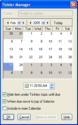 You can assign a Tickler to any item in the Selector. For example, you can assign a tickler to an e-mail message which should be sent on a certain date.
