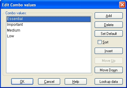 Click Insert to insert the new value into the list. Click Default to set the selected item as Default List value. This value will be automatically inserted into all new records. - Click OK.
