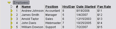 The image below shows an example of using a Selector Grid for storing employee information. Each row in such grid contains the employee’s name, position, number of hours he works per day, starting date and the pay rate. Each row can be expanded to store additional free-form information about the corresponding employee.