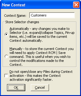 2. Type in the Context Tab name and choose how Selector changes will be stored:Automatically – any changes you make to the Selector (e.g. expand/collapse Topics, Pin-Up items, etc.) will be saved to the current Context whenever a change is made;