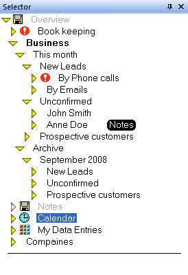 The Selector is your control center for viewing and organizing data in outline form. It provides a tree-like representation of your data for fast and convenient access. For example, you can organize data on a certain project by dividing it into topics and sub-topics.