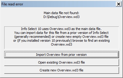 - If you want to import your old data now choose Import Overview from prior version, browse to the folder where your old files are located and click Select. Your old data should appear in the Selector.If you want to import your old data later choose Create new Overview.wd3 file and Info Select will start with an empty Overview.If you are upgrading from version 3, 4, 5, 6, 7, 8 or 2007: To retrieve your old data, (you only need to do this once) choose Home | Open | Import | *.wd2; navigate to the old data directory (usually C:\ISW3 or C:\Program Files\Info Select); and select the WD2 file(s) that you were using. Refer to the dates and sizes of each file to help determine which files were actively used.If you are upgrading from version 1 or 2: To retrieve your old data and to learn about the differences between the old and new versions click here.