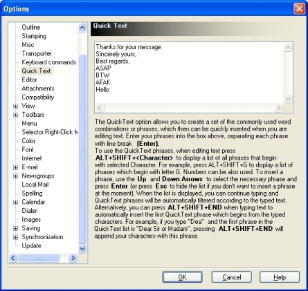 - Choose Menu Ribbon | Home | Options | QuickText. A dialog box appears: