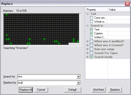 - Press Find Next. Then choose Replace if you want to review each replacement before it occurs or Replace All if you want to complete the task in one step. If you use Replace, you can also skip an occurrence of the word or phrase by clicking the Find Next button. To reset the Replace dialog settings click Default button.