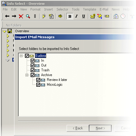 You can now import e-mail messages from Eudora allowing you to centralize all your information in one place and move your old messages over to Info Select. Email is ideal in Info Select as you can organize your email along with other data that relates and search thru your email and data lightning fast.